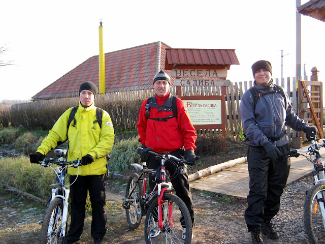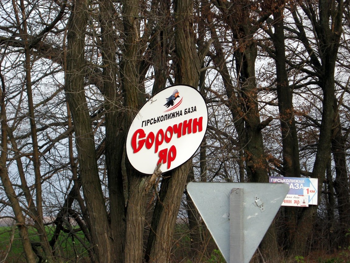 Все время продвигаясь вперед грунтовыми дорогами проходящими вдоль посадок мы добрались до деревни Веселовка. Сфотографировались на фоне входа в ресторан "Весела садиба" и двинулись асфальтом в сторону горнолыжной базы "Сорочин Яр".