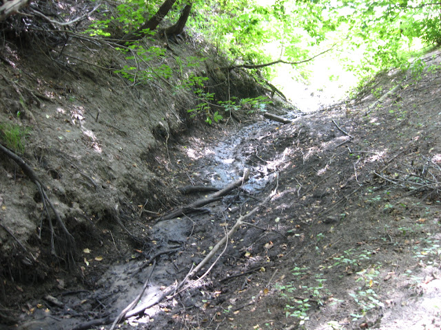 Сейчас составляя этот отчет, я имею возможность прикинуть сколько мы прошли по лесу - чуть более 1 километра, но для нас городских жителей без должной экипировки это был полный экстрим. Продираться приходилось через кустарники и заросли крапивы (при том, что все мы были в шортах). Несколько раз мы подходили к берегу Ворсклы, который в этих местах был обрывистый и заросший кустарником и камышом. И вот вскоре мы нашли устье реки Доброшин. Оно оказалось довольно глубоким оврагом но на наше счастье в данный момент пересохшим. Перейдя через устье мы вышли на небольшой пляжик где немного отдохнули